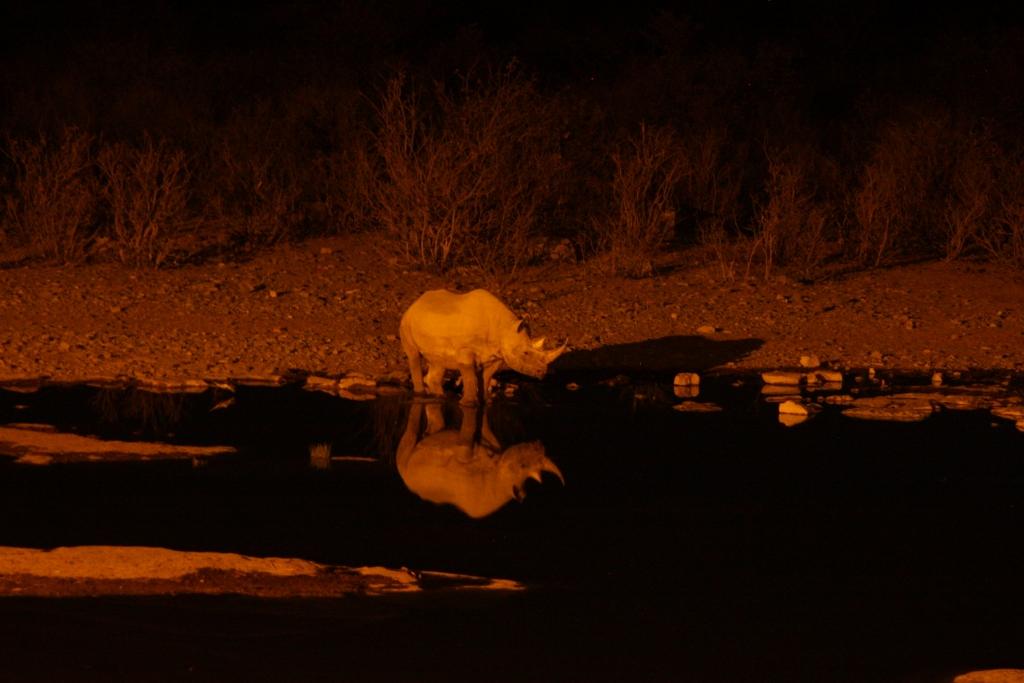 L’animal boit puis relève la tête et reste totalement immobile pendant quelques minutes. Il boit à nouveau puis pose à nouveau… L’appareil photo est posé sur la rampe et l’immobilité parfaite du rhinocéros compense la faible lumière des éclairages du campement.
