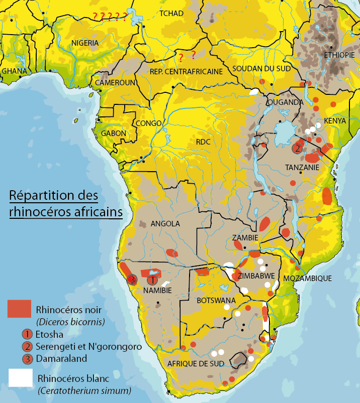 Le rhinocéros noir est une espèce dont la répartition est très éclatée en Afrique. On distingue d’ailleurs 3 sous-espèces (une 4e a été déclarée éteinte en 2011).