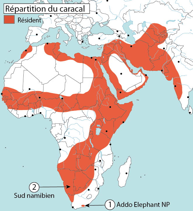 De façon simplifiée, dans l’objectif de les observer, on peut diviser la répartition du caracal en 3 zones :