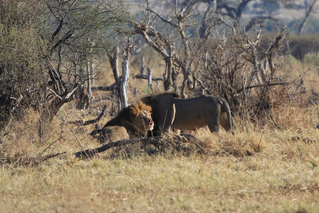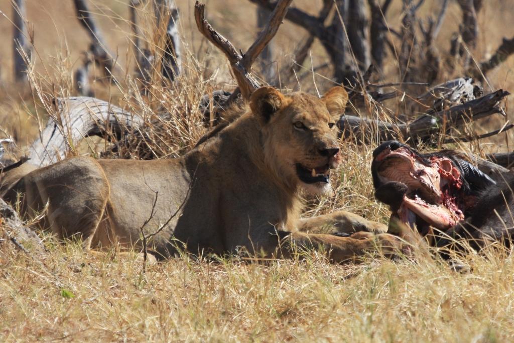 Les lions passent 20 heures sur 24 à dormir ou se reposer. Il faut avoir du temps et de la chance pour en voir en déplacement. Ce mâle adulte (à gauche), comme ce jeune mâle (ci-dessous), viennent juste de manger. On distingue un autre lion près d’une carcasse au second plan.