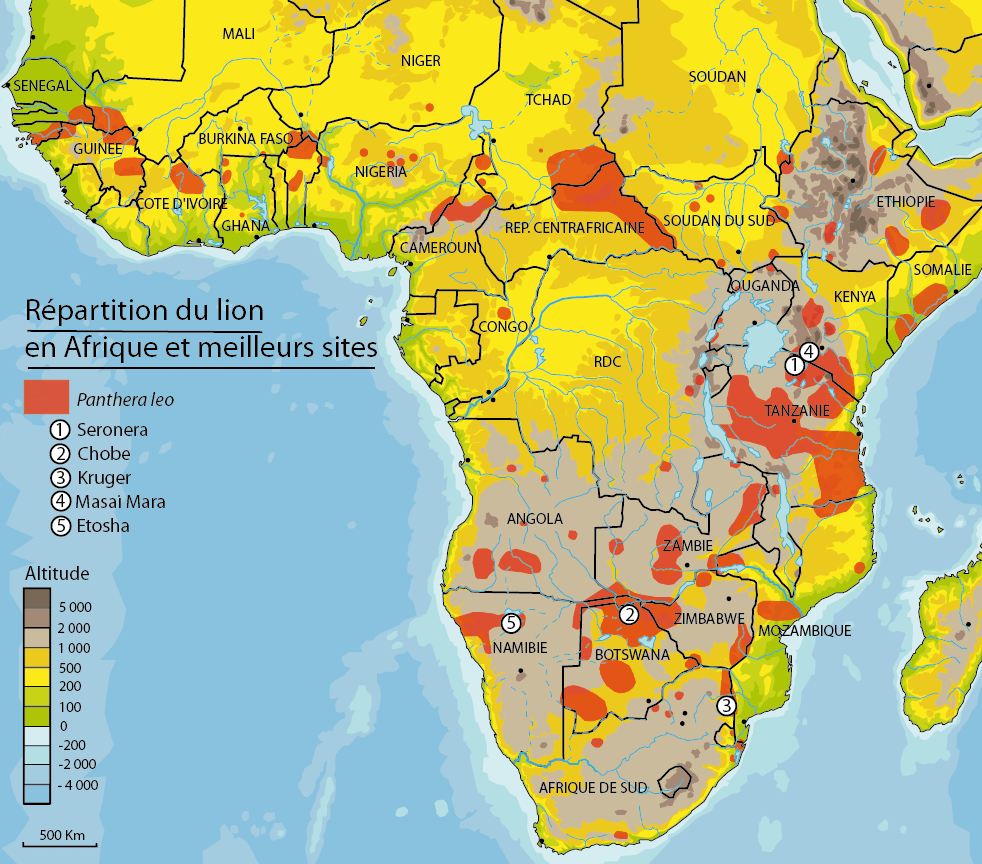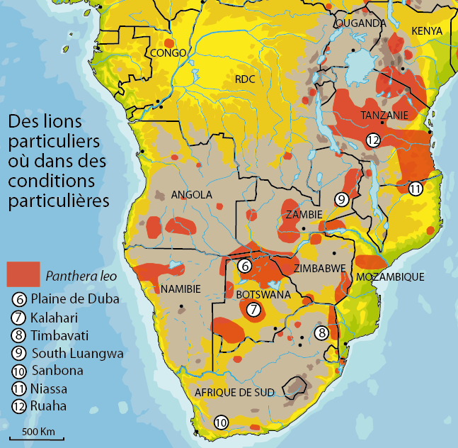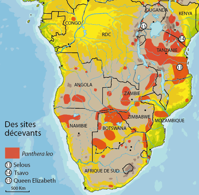– 13 et 14 : la réserve de Selous (Tanzanie) et celle de Tsavo (Kenya) : dans ces réserves, un bon nombre de lions, dont parfois des mâles dominants, n’ont pas ou peu de crinière. C’est aussi le cas des quelques 500 lions indiens, localisés dans la forêt de Gir.