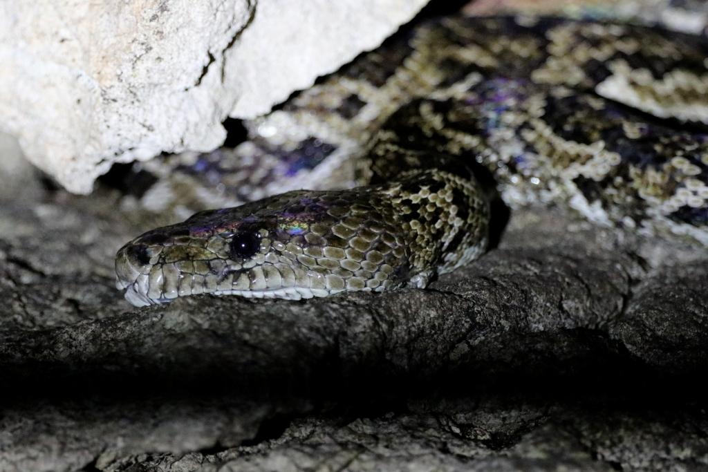 En descendant dans la grotte, je suis passé à deux mètres de ce serpent sans le voir. En inspectant la grotte à la lampe électrique, on découvre un lieu riche en biodiversité: un crabe, un anolis géant, une tarentule, beaucoup de chauves-souris… et ce n’est qu’après avoir vu tout ce petit monde qu’on découvre le serpent tout près de l’entrée.