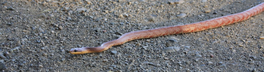 A la tombée du jour, ce serpent traversait la piste tranquillement. J’ai eu le temps de m’arrêter, de descendre de voiture et de prendre quelques photographies. Il est resté calme et a poursuivi sa route.