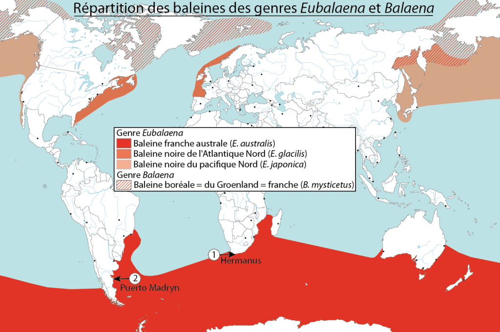 Le genre Eubalaena regroupe 3 espèces de baleines dont le comportement convient bien à l’observation : elles s’approchent près des côtes pour mettre bas ; elles nagent lentement ; elles ne sont pas farouches. Mais les 2 espèces du nord sont en danger d’extinction avec moins de 400 individus par espèce. Par comparaison, la baleine franche australe se porte bien.