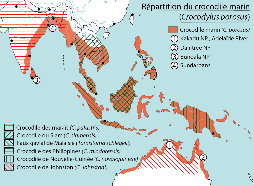 – 4 : régions des Sundarbans (Inde) : attention de ne pas le confondre avec le crocodile des marais (Crocodylus palustris) à l’intérieur des terres.