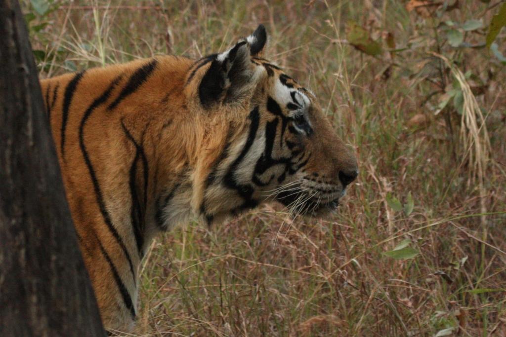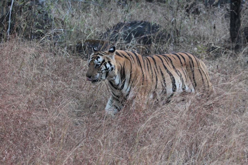 Ce matin là, le premier à Kanha NP, on n’est rentré depuis seulement une petite demie-heure. Le Soleil est encore trop bas pour éclairer la piste. Un gros tigre mâle descend d’une zone rocheuse. Nous sommes le seul véhicule au début et le tigre se déplace tranquillement parallèlement à la piste. Il s’arrête parfois pour renifler. La végétation, avec des herbes hautes dans le sous bois, ne facilite pas les photographies mais l’animal est magnifique. Bientôt, il va traverser la piste juste derrière le véhicule. Je suis à 5 m de lui dans une jeep ouverte. Il nous ignore totalement. Il disparait bientôt dans la forêt. L’observation a durée environ 5 minutes. C’est ma plus belle rencontre en 12 demi-journées consacrées aux parcs à tigres indiens…
