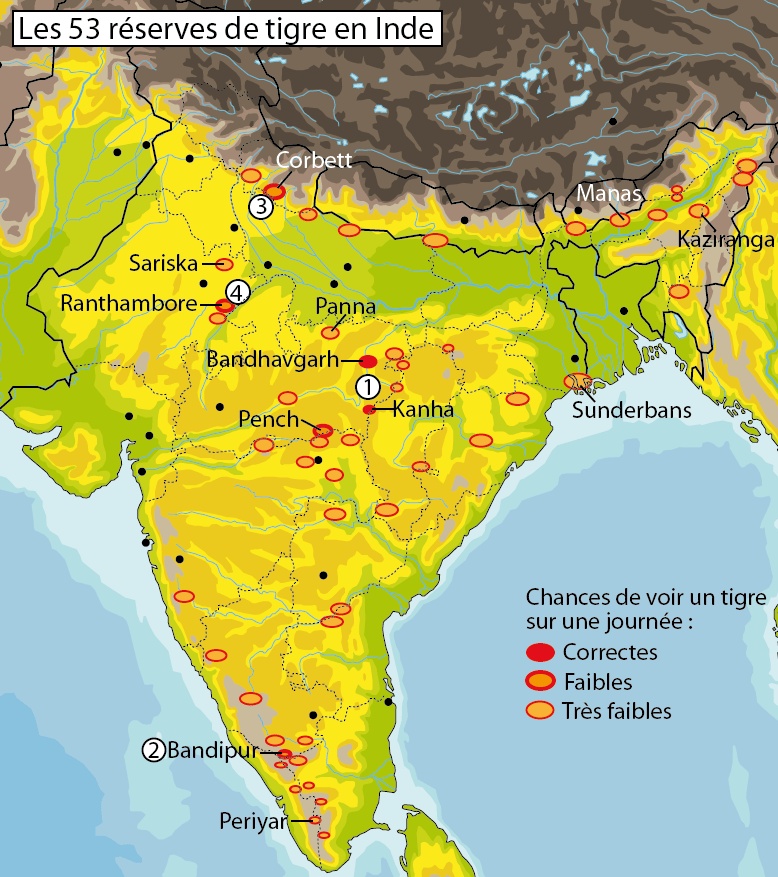 En 2022, selon les autorités indiennes, il y aurait 2 967 tigres en Inde (les chiffres par réserves donnent en fait des fourchettes) ce qui représenterait 70% des tigres sauvages. La population augmenterait de 6% par an. Ce qui est certain, c’est qu’il y a aujourd’hui 53 réserves de tigres. Une fois supprimer les réserves très compliquées d’accès, les réserves non aménagés pour les touristes, les réserves où le paysage est trop fermé et les réserves où la densité de tigres est très faible, il ne reste que quelques sites :