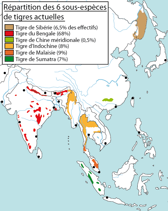 Les tigres survivants sont divisés en 6 sous-espèces :