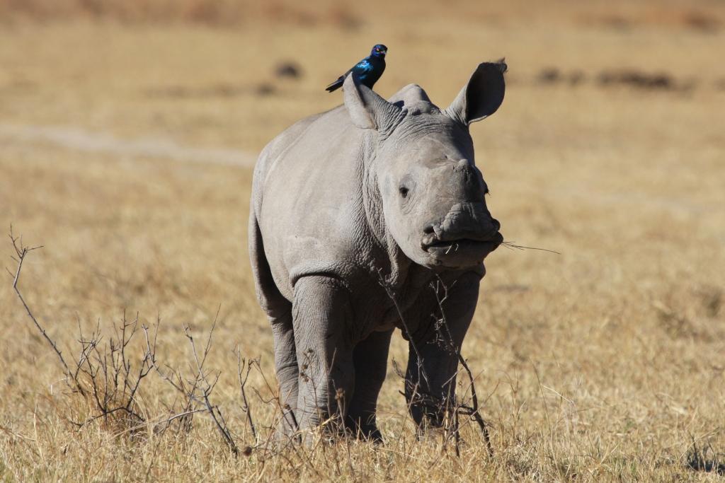 Ce jeune rhinocéros ne risque rien dans ce parc du Botswana où les grand prédateurs sont absents. Il se montre curieux mais ne s’éloigne guère de sa mère. Un choucador inspecte son dos .