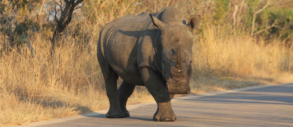 Au Kruger NP, un groupe de 4 rhinocéros blancs s’activaient lentement sur la route. Quelques voitures s’arrêtent. Un 5e rhinocéros sort de la savane juste devant mon véhicule et observe… Là, on se sent tout petit. On reste immobile et on a peur pour la voiture de location (photo ci-dessous). C’est alors qu’un touriste pressé redémarre et décide de doubler… Le rhinocéros balance la tête et part en trottant, sans toucher aucun véhicule…