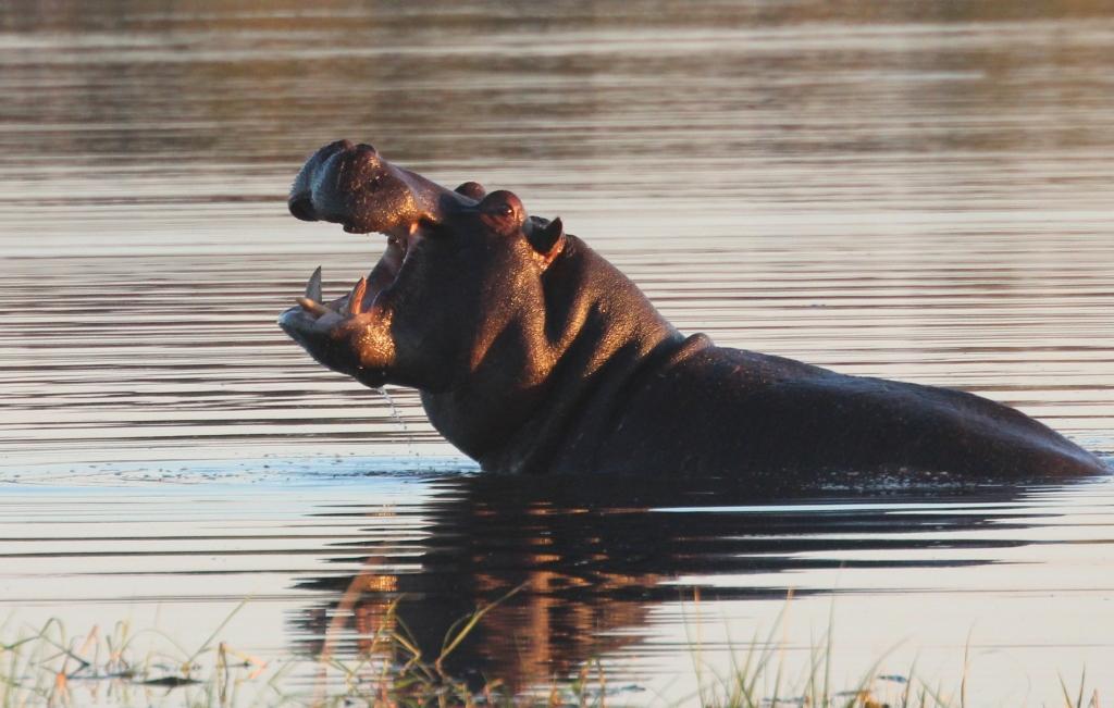 Le soir, les hippopotames sont plus actifs. Ce mâle montre les dents malgré l’absence de rival.