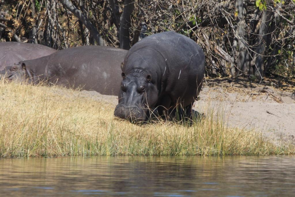 Au petit matin, à la sortie de la tente, cet hippopotame broute à une centaine de mètre… La sécurité est minimale.