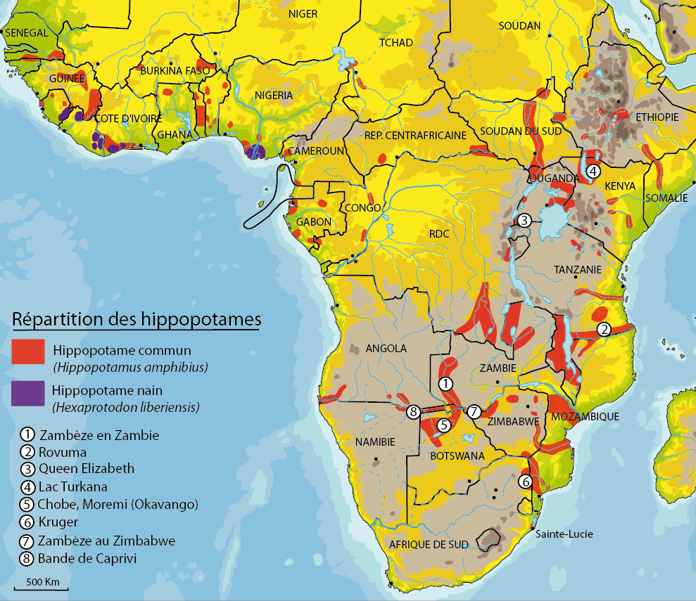 6- en Afrique du Sud (Kruger, Pilanesberg, Sainte-Lucie…) : les densités sont faibles mais on en voit facilement au bord des gros plans d’eau. A Sainte-Lucie, les hippopotames circulent parfois de nuit dans la ville.