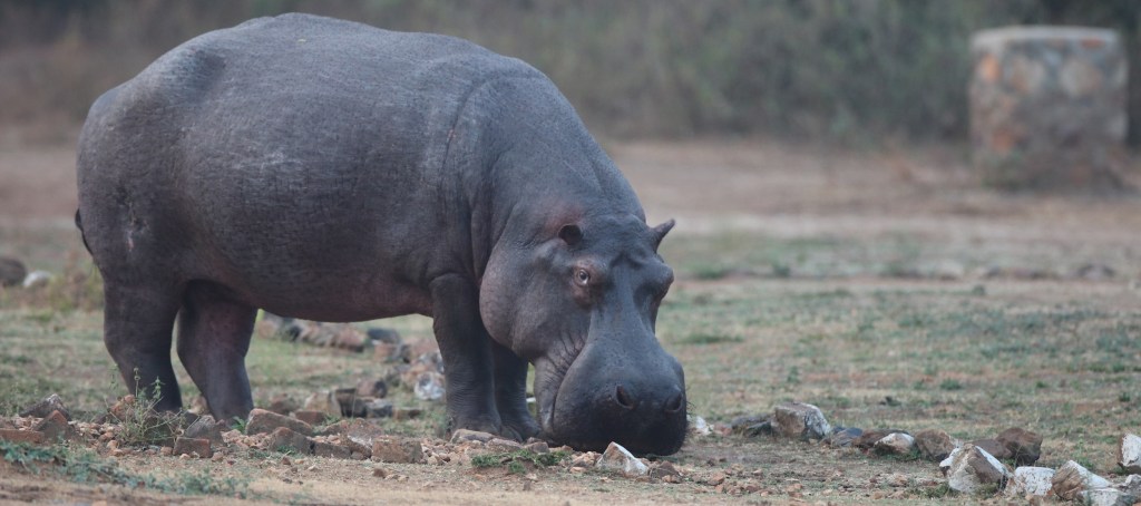 Un hippopotame broute aux heures chaudes pendant que tous les autres dorment.