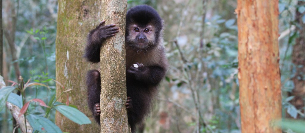 Dans les arbres fruitiers, il entre en compétition avec l’atèle arachnoïde (Brachyteles arachnoides). Selon la taille des groupes, c’est soit les atèles, soit les sapajous qui parviennent à s’imposer.