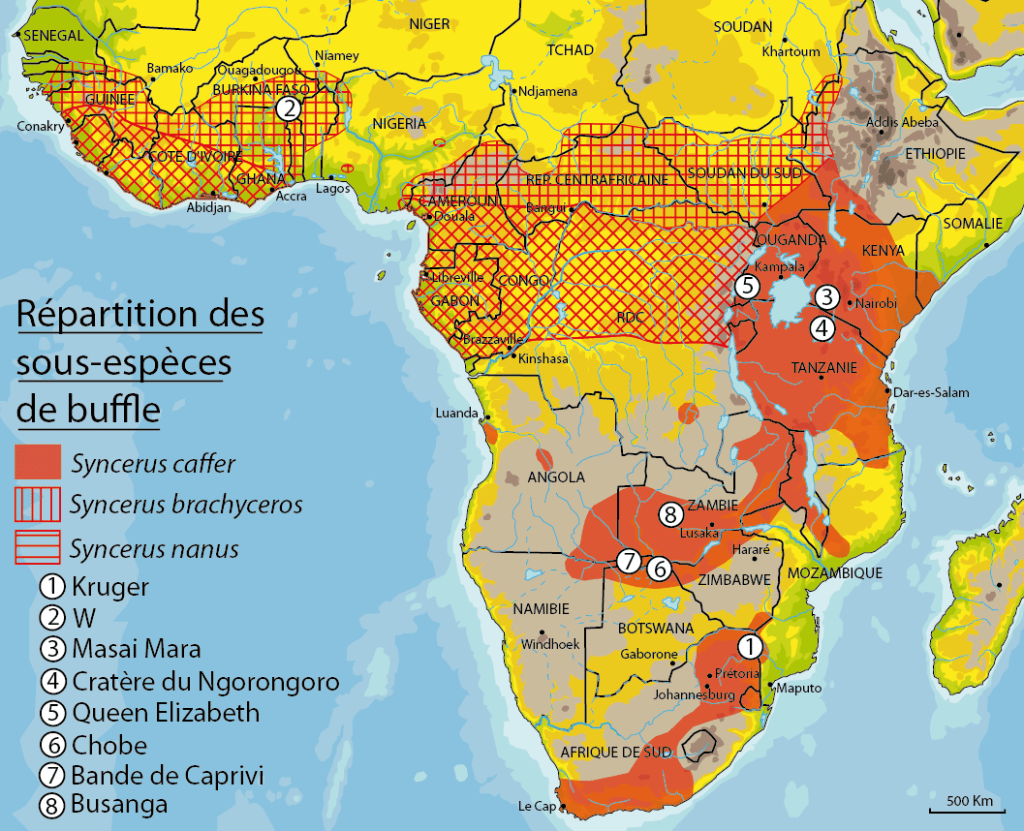 C’est la seule espèce du genre Syncerus. Le genre est divisé en 3 à 5 sous-espèces. La plus imposante est Syncerus caffer caffer. Cette sous-espèce est de très loin la plus facile à observer car présente dans toutes les grandes destinations safaris d’Afrique de l’Est et du Sud. Les sous-espèces d’Afrique de l’ouest et d’Afrique centrale fréquentent un habitat plus forestier et donc moins favorable à la visibilité.