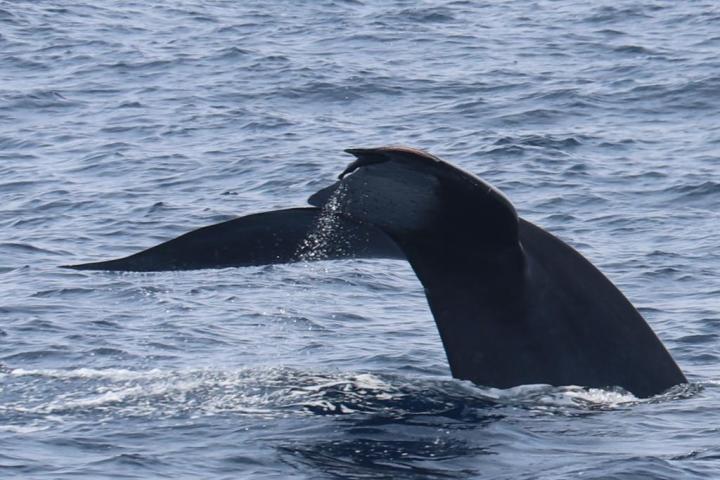 Une énorme queue de baleine bleue; le souffle très haut et groupé caractéristique; l’évent en position plus haute que chez les autres grands cétacés.