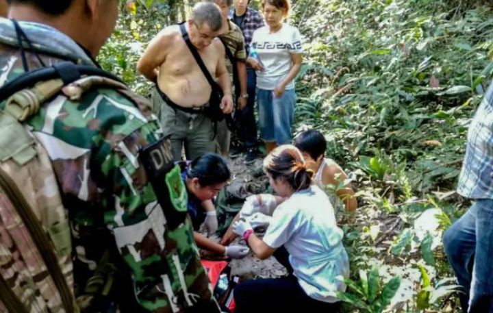 Six jour plus tard, une touriste française se faisait mordre par un crocodile de Siam à Khao Yaï NP après avoir tenté de faire un selfie avec le crocodile. Mordue à la jambe, elle va être évacuée sur un brancard… Je découvre ça dans la presse française (photo de presse ci-contre, source AFP).