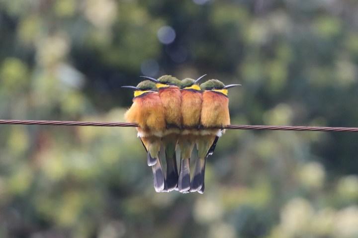 En altitude au Kenya, il fait froid pendant la nuit. Ces guêpiers se tiennent chauds et reste blotis ainsi au petit matin (août 2025).
