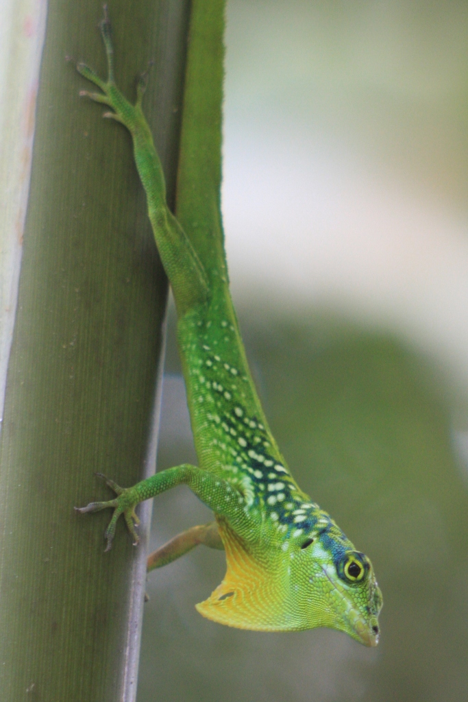 Cet anole de Martinique se tient dans sa position caractéristique: la tête en bas. Son fanon gulaire est abimé.