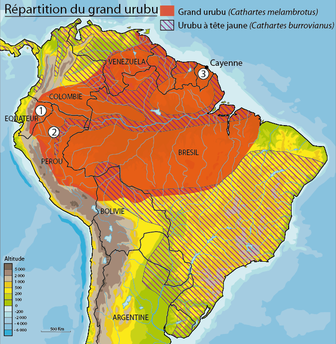 – répartition : l’urubu à tête jaune est normalement absent en Equateur et en Guyane.