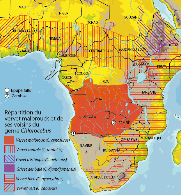 Il est présent à l’extrême nord de la Namibie (attention, à l’extrême sud, c’est le vervet bleu, Chlorocebus pygerythrus). De même, sur les frontières Sud et Est de la Zambie, on peut rencontrer cette seconde espèce.