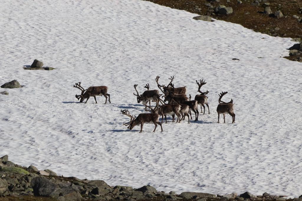 – les rennes cherchent la fraicheur et restent davantage sur des zones encore enneigées où on les repère facilement.