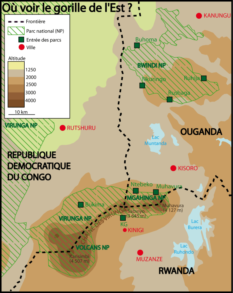 1- Le parc national de Bwindi (Ouganda): on y dénombre un peu plus de 400 gorilles (la population augmenterait de 2% par an) divisés en une 30e de groupes dont 18 « habitués » pour permettre une observation par les touristes. Ce parc compte 4 entrées dont la plus ancienne est celle de Buhoma.