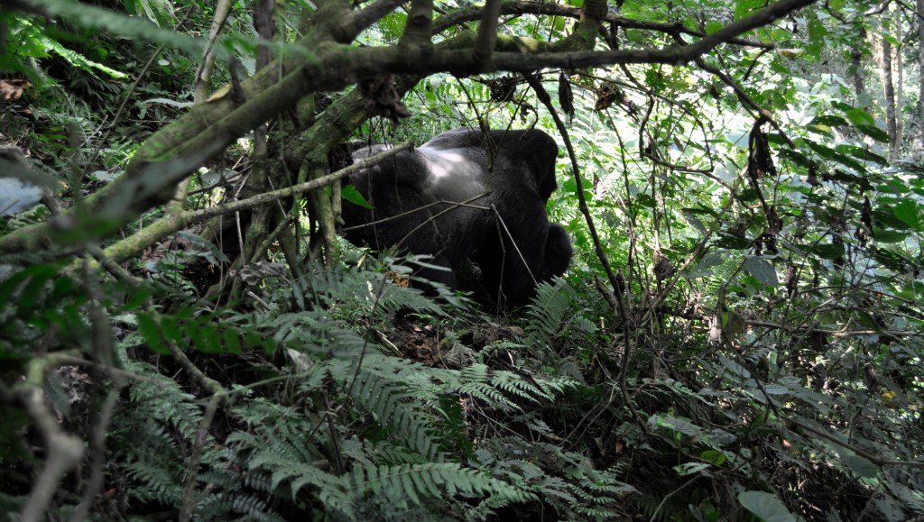 Lorsque les groupes se déplacent, on doit les suivre… On se retrouve souvent avec des gorilles vus de dos. Celui-ci se nourrit. Il s’est retourné juste le temps de prendre une photographie.