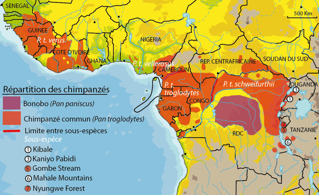 – le chimpanzé commun (Pan troglodytes), beaucoup plus largement réparti, et divisé en 4 sous-espèces.