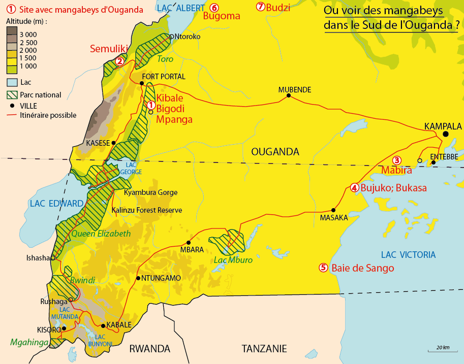 En Ouganda, évidemment… Avec 22 espèces de primates (15 diurnes ; 7 nocturnes), les Ougandais aiment bien dire que c’est la seule espèce endémique… Mais il y a une petite population de mangabeys d’Ouganda en Tanzanie dans la réserve forestière de Minziro