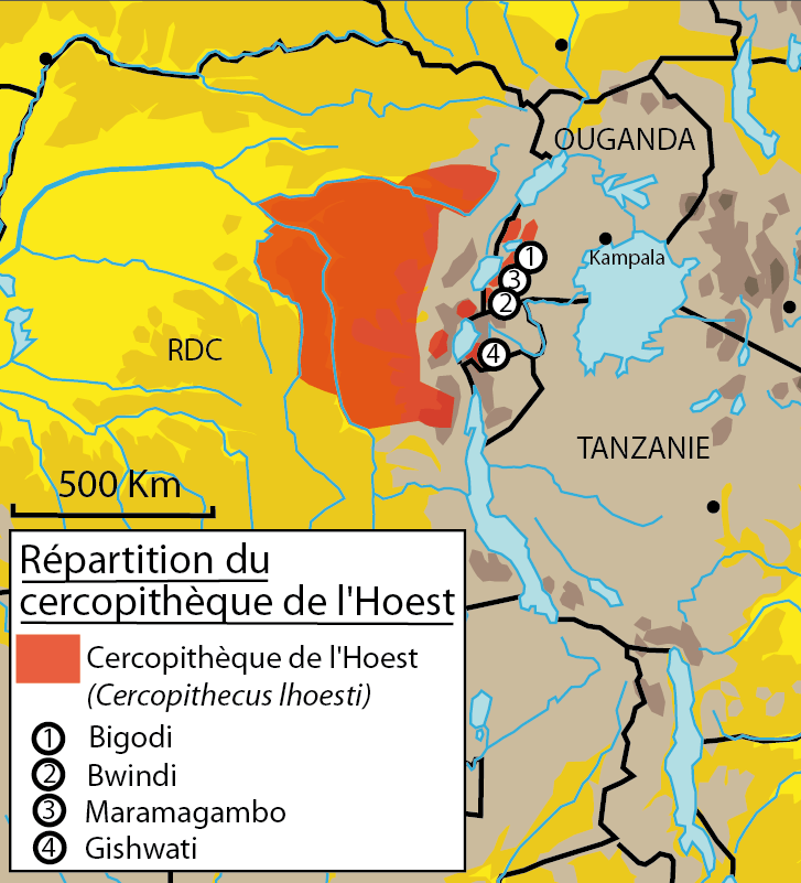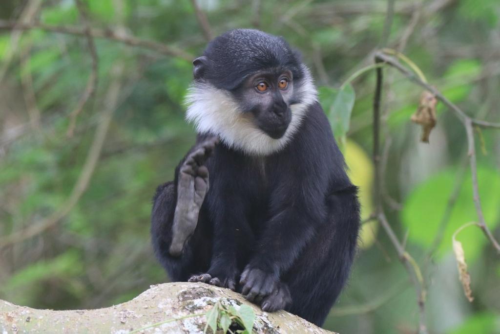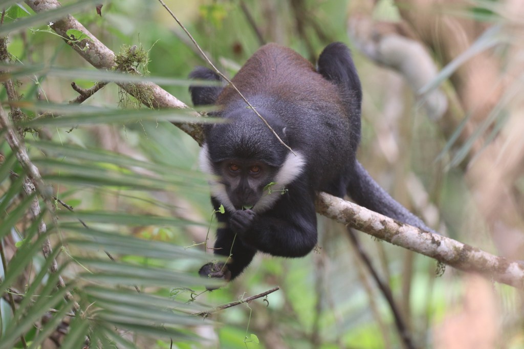 Le cercopithèque de l’Hoest est une espèce monotypique endémique du rift albertin. Facile à déterminer, avec son col blanc, c’est une espèce plus difficile à observer que la plupart des autres cercopithèques du centre de l’Afrique pour 3 raisons: