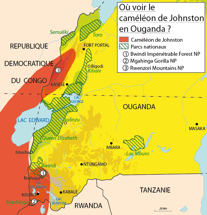 – 2 : Mgahinga Gorilla NP : la porte d’entrée principale du parc national de Mgahinga est un bon endroit pour chercher. Des caméléons peuvent être présents dans les haies qui bordent la piste ou dans les bosquets des jardins.