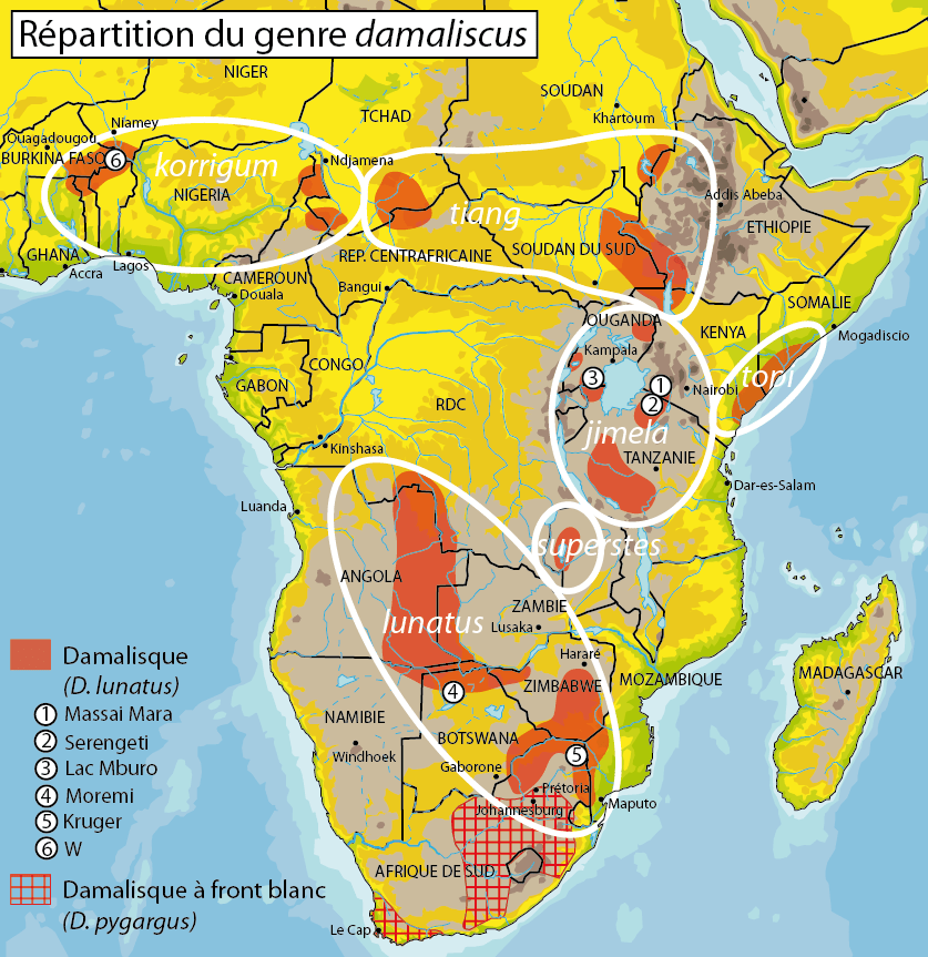 – le damalisque (D. lunatus) : C’est l’animal traité ici. Sa répartition est extrêmement éclatée dans toute l’Afrique noire de sorte qu’il est évident que le brassage génétique ne se fait plus entre différents groupes. Pour le naturaliste amateur, ces animaux sont quasiment identiques et seule leur répartition permet de les séparer.