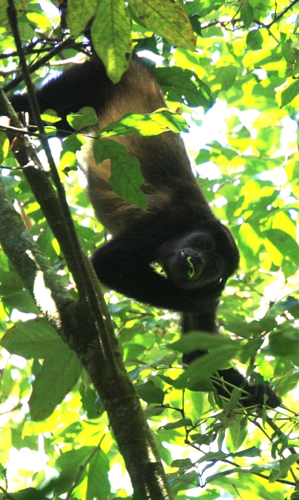 On est ici tout près de la Leona, l’entrée sud du parc national de Corcovado. et il n’y a pas besoin de rentrer dans le parc pour voir les 4 espèces de singes du Costa Rica. On voit particulièrement bien « les boules » (le scrotum) blanches qui permet de reconnaître les mâles mâtures.