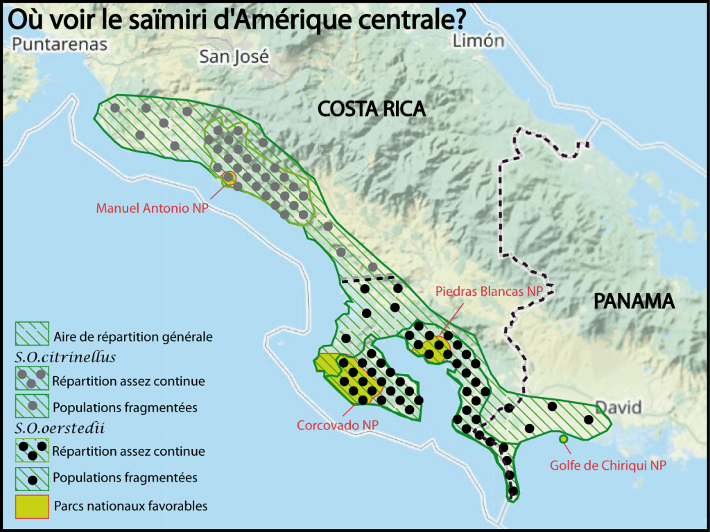 1: le parc national Manuel Antonio (580 saïmiri) et ses alentours. Il y en a autant dans la zone périphérique du parc.