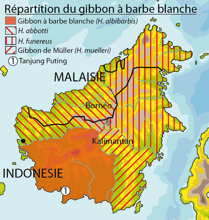 Le gibbon à barbe blanche vit exclusivement dans un quart Sud-Ouest de Bornéo. Il n’est donc présent qu’en Indonésie. Le parc de Tanjung Puting est le seul endroit où il est accessible, sauf expédition aventureuse.