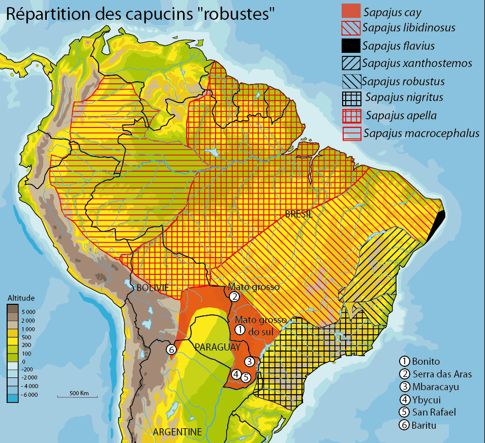 – 1 : Réserves autour de Bonito: la Reserva ecologica Baia et les fazenda Barma ou Barbara (Mato Grosso do Sul). Dans ces espaces, le sapajou du Paraguay est habitué aux hommes. Localement, on lui donne un peu de nourriture pour le rapprocher des touristes.