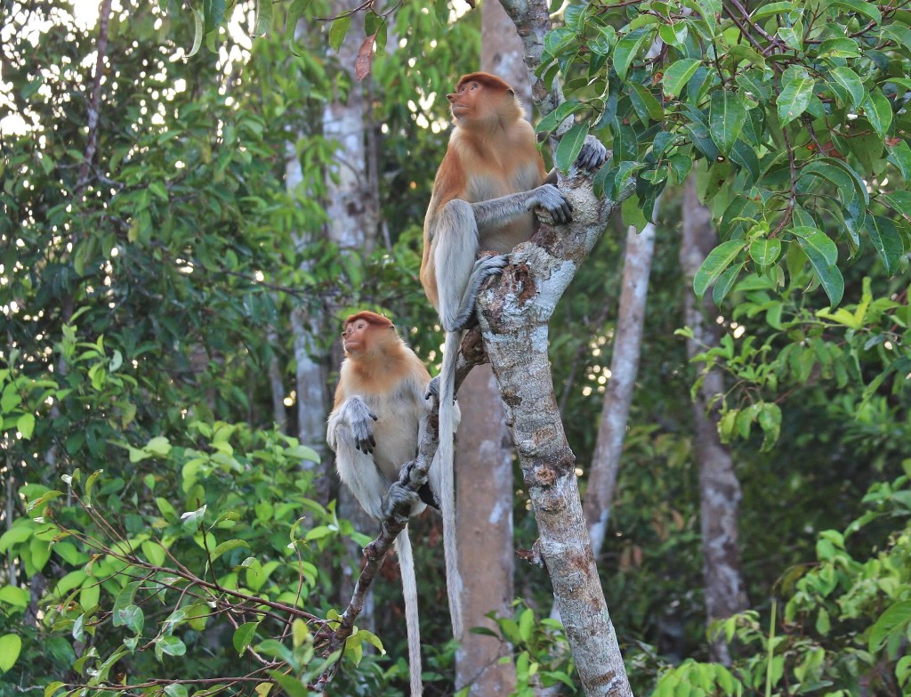 Les nasiques n’ont qu’un seul petit par portée. La femelle du premier plan garde un oeil sur le mâle dominant.