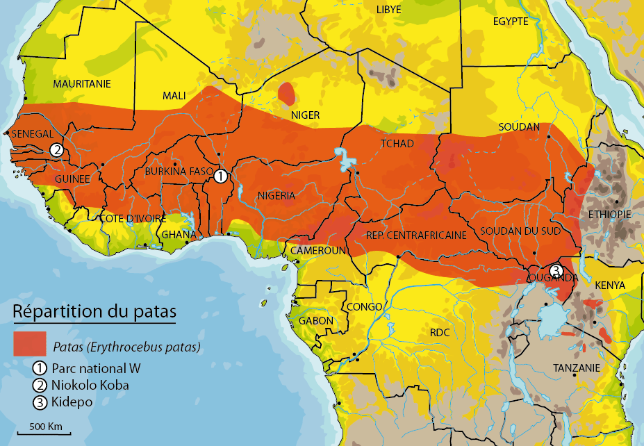 C’est un primate africain présent dans tous les pays du Sahel (du Sud de la Mauritanie au Sud du Soudan) et dans tous les pays à la latitude du golfe de Guinée (du Nord de la Guinée au Nord de l’Ouganda). De petites populations sont présentes au Kenya et en Tanzanie mais il est très rarement observé dans ces pays malgré la forte pression d’observation.
