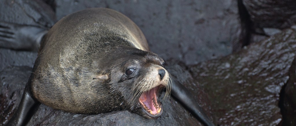 C’est la scène la plus caractéristique : un animal qui dort à l’entrée d’une cavité formée par une ancienne coulée de lave. Difficile de voir des otaries à fourrure des Galapagos avec les yeux ouverts.