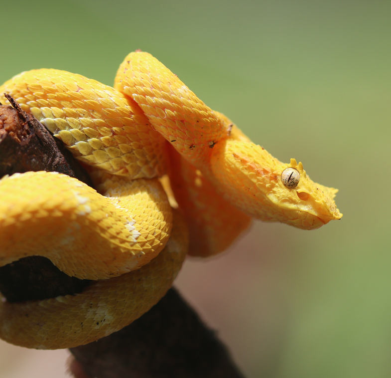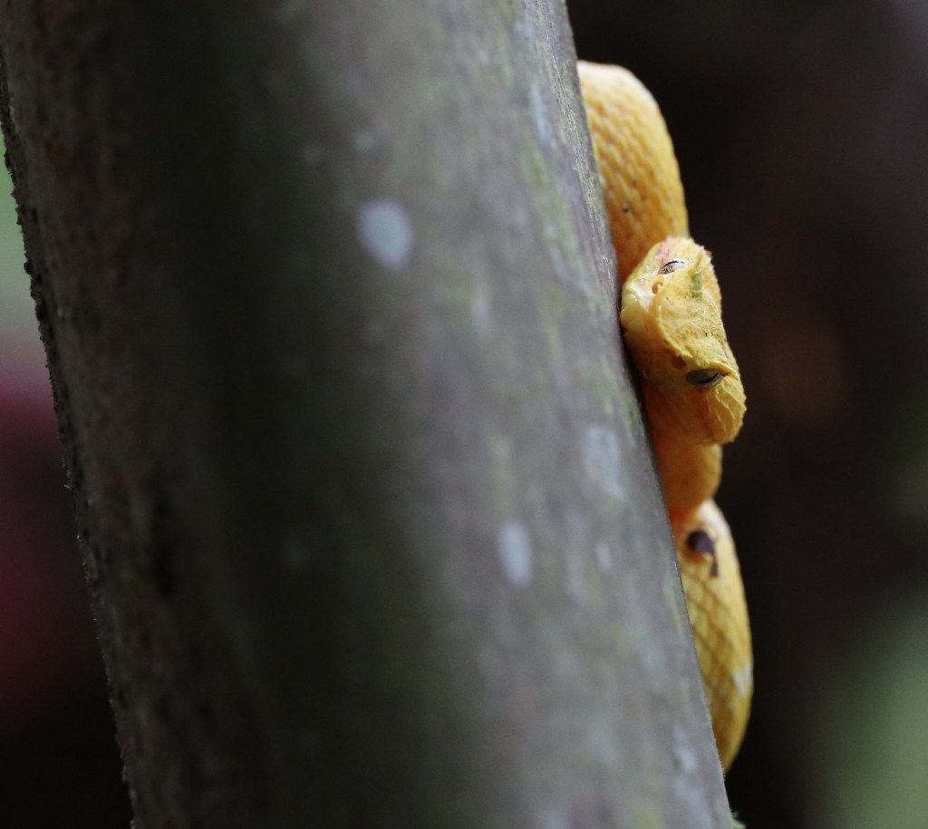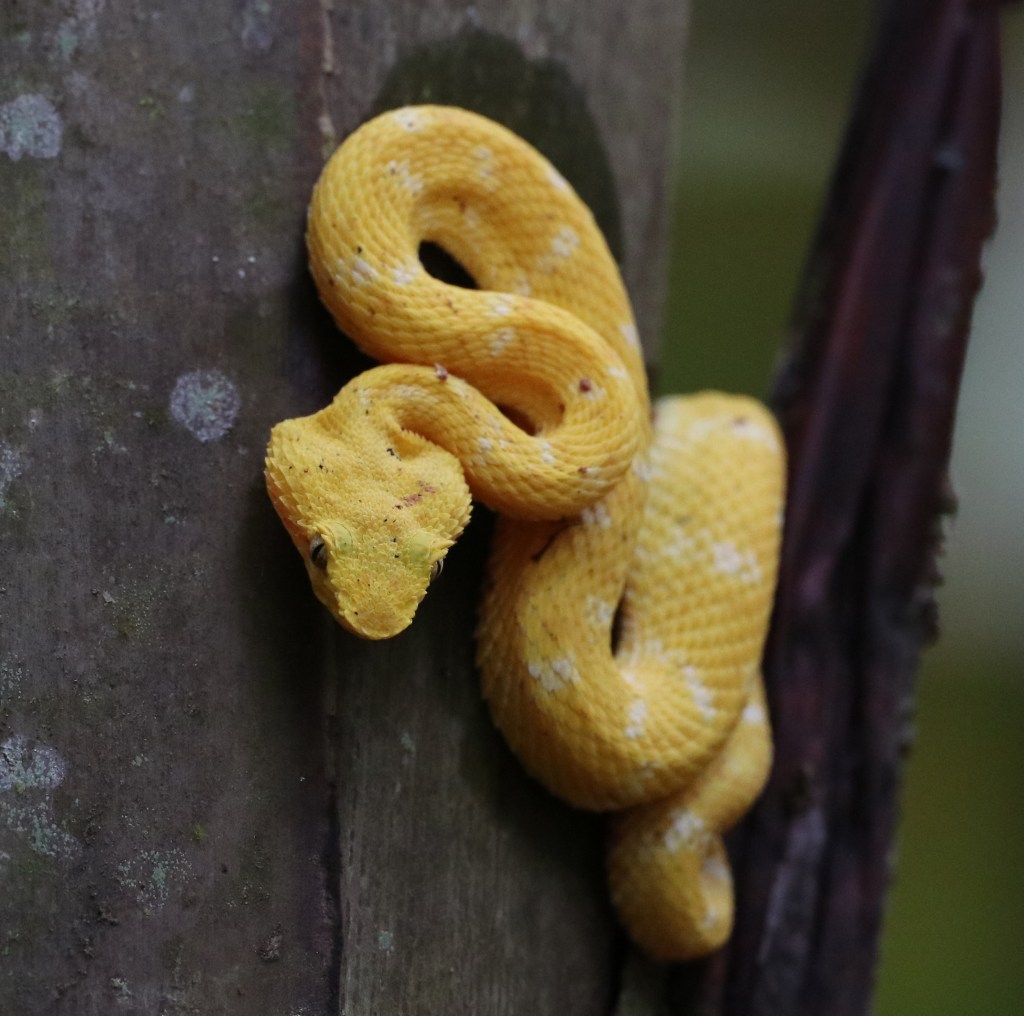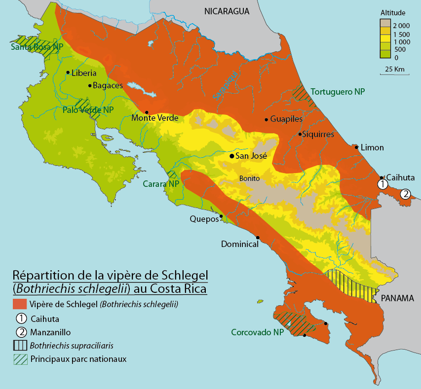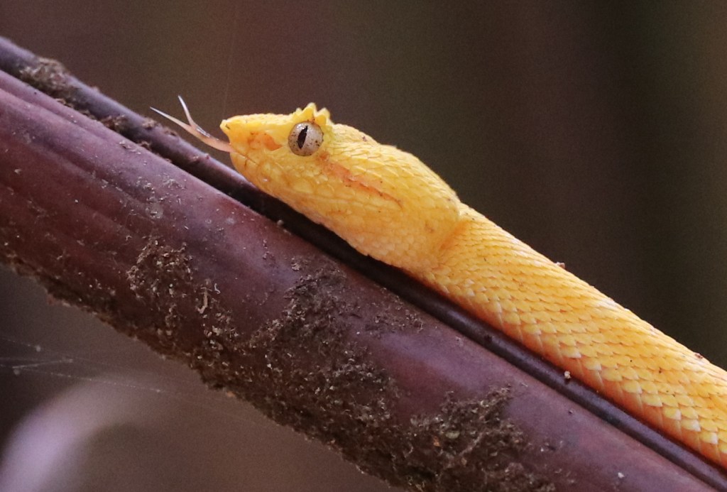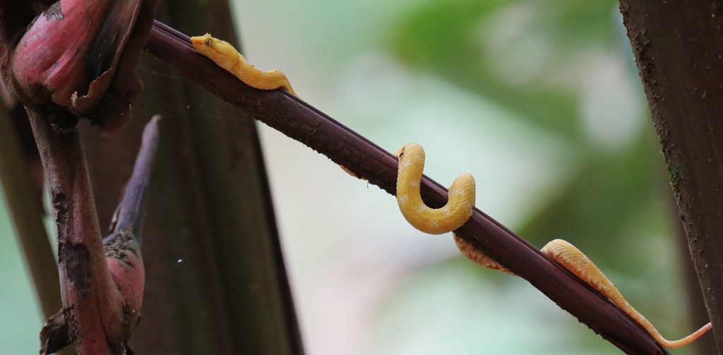 La vipère de Schlegel est un serpent arboricole emblématique en Amérique centrale. Au Costa Rica, elle est présentée sur de nombreux panneaux d’information ou de publicités, toujours sous sa forme jaune… cette forme jaune, la plus spectaculaire, fait parfois oublier qu’il s’agit en fait d’une espèce de couleur extrêmement variable. Dans une même portée, même de parents non jaunes, on peut avoir des individus cryptiques et des individus jaunes. En 2023, une étude a montré que la vipère de Schlegel devait être divisée en au moins 5 espèces de vipères à cils dont Bothriechis nigroadspersus au Costa Rica.