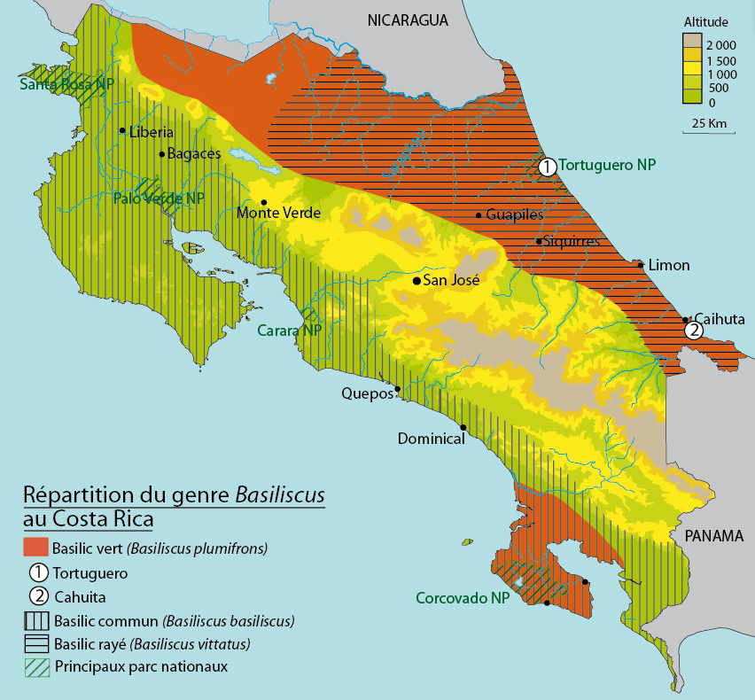 – le long des cours d’eau : c’est probablement le plus aquatique des basilics.