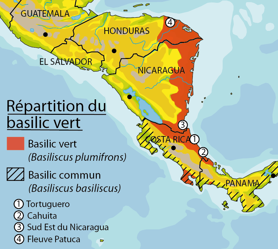 La répartition du basilic vert se limite à 4 pays d’Amérique centrale, du Sud du Honduras au Nord de Panama. Il est présent essentiellement à l’Est, côté atlantique, où il n’y a pas de véritable saison sèche. Bien que présent sur la péninsule de Osa (Parc national du Corcovado) au Costa Rica et au Sud Ouest du Panama, il y est rare et moins présent que le basilic commun. Il ne faut donc pas trop espérer l’observer sur la côte Pacifique.