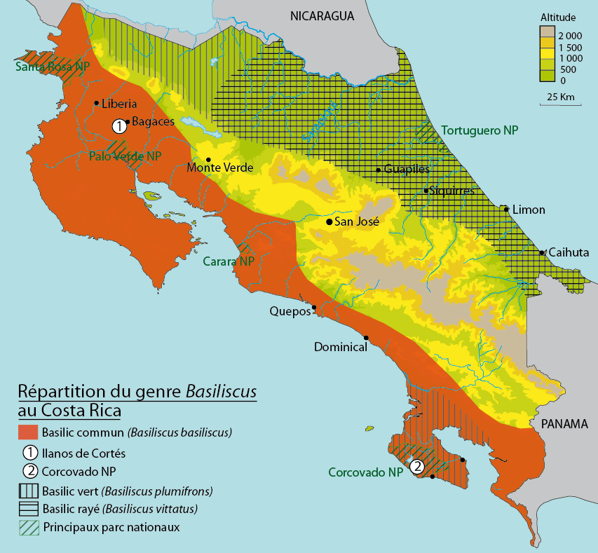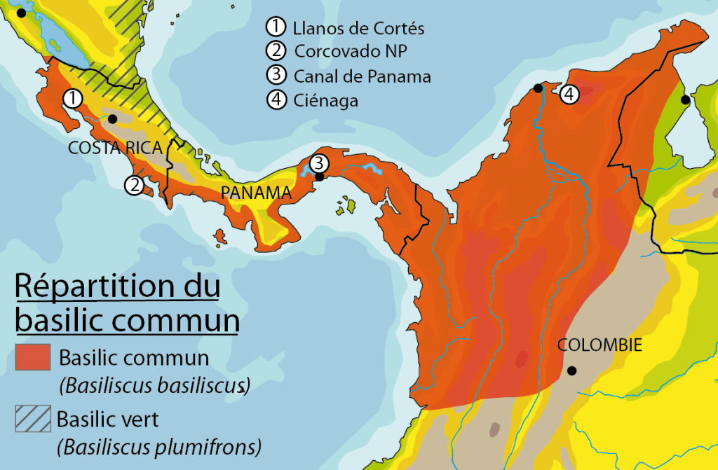 Les observations sont nombreuses au Costa Rica où il n’occupe pourtant qu’une petite partie du pays . Le nombre de données est un peu plus faible au Panama et en Colombie. Dans ce dernier pays, les connaissances sur la répartition sont insuffisantes. Le basilic commun disparaît généralement au dessus de 1200 m.