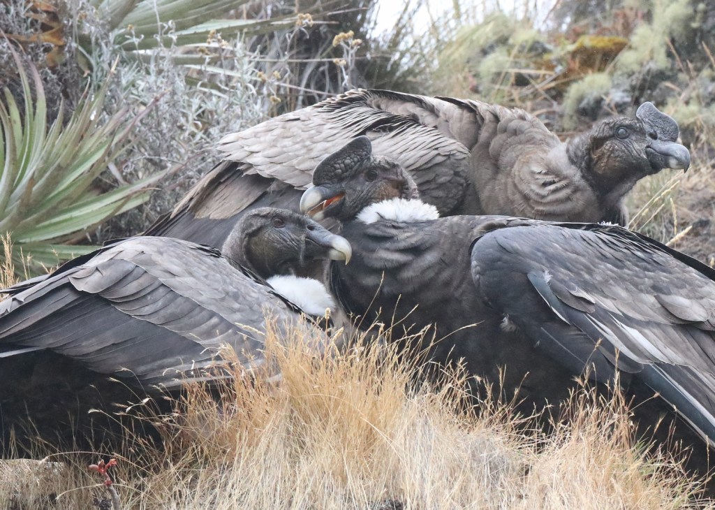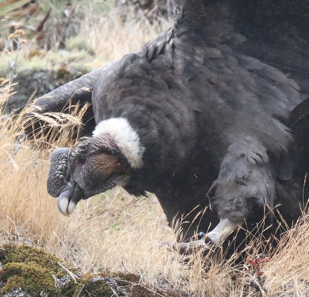 – 2 : la réserve Ecologique d’Antisana (Equateur) : il n’y a qu’une centaine de condors en Equateur répartis en 70 gîtes. 35 condors sont présents sur la réserve d’Antisana, un site où on a toutes les chances de le voir. Peu avant l’entrée de la réserve (côté Quito), une plateforme a été aménagée face à une vallée très encaissée. En face, on remarquera vite les rochers couverts de fientes et quelques condors. La falaise est à l’ombre le matin. Du coup, les oiseaux choisissent parfois une autre zone pour ce percher le matin et mieux profiter des courants d’air ascendants. Lors de mon passage en août 2022, un groupe de 14 condors s’étaient posés sur les petites falaises, côté route, environ 800 m après l’entrée de la réserve écologique.