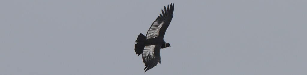 Photo 9 : Mâle en vol : les grandes taches blanches sur le dessus des ailes sont caractéristiques. Elles permettent une identification de très loin. Malgré la différence de taille, vu de dessous, la condor peut être confondu avec un urubu à tête rouge.