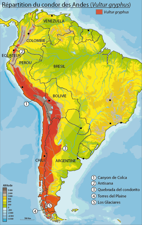 – 1 : en Argentine et au Chili : cela s’explique en partie par le fait qu’au Sud de ces pays, le condor des Andes fréquente des altitudes plus basses.