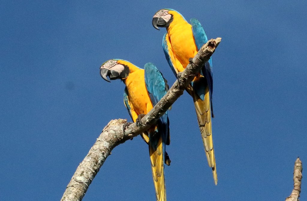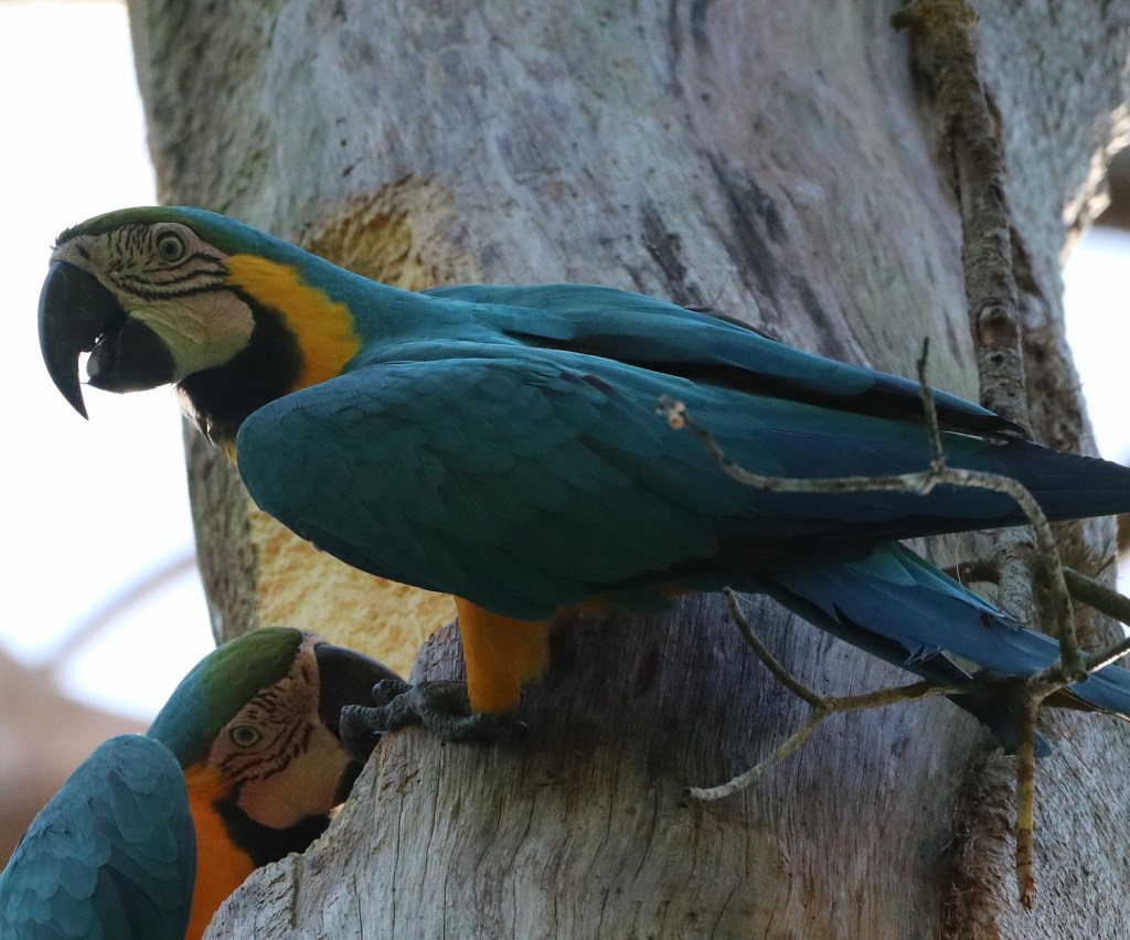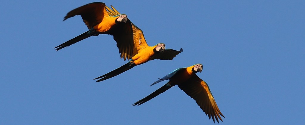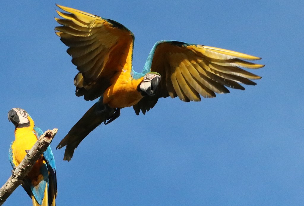 – le matin juste après le lever du soleil et le soir avant son coucher : ce sont les meilleurs moments pour les voir en vol. Les aras sont alors hyperactifs. Ils vont et viennent en ligne droite entre leur dortoir et leur site d’alimentation. Ils circulent par 2, 4, 6 en émettant leurs cris retentissants. Ils volent assez haut (jumelles et téléobjectifs bienvenus) mais c’est un bon moment pour les photographies avec un éclairage magique.