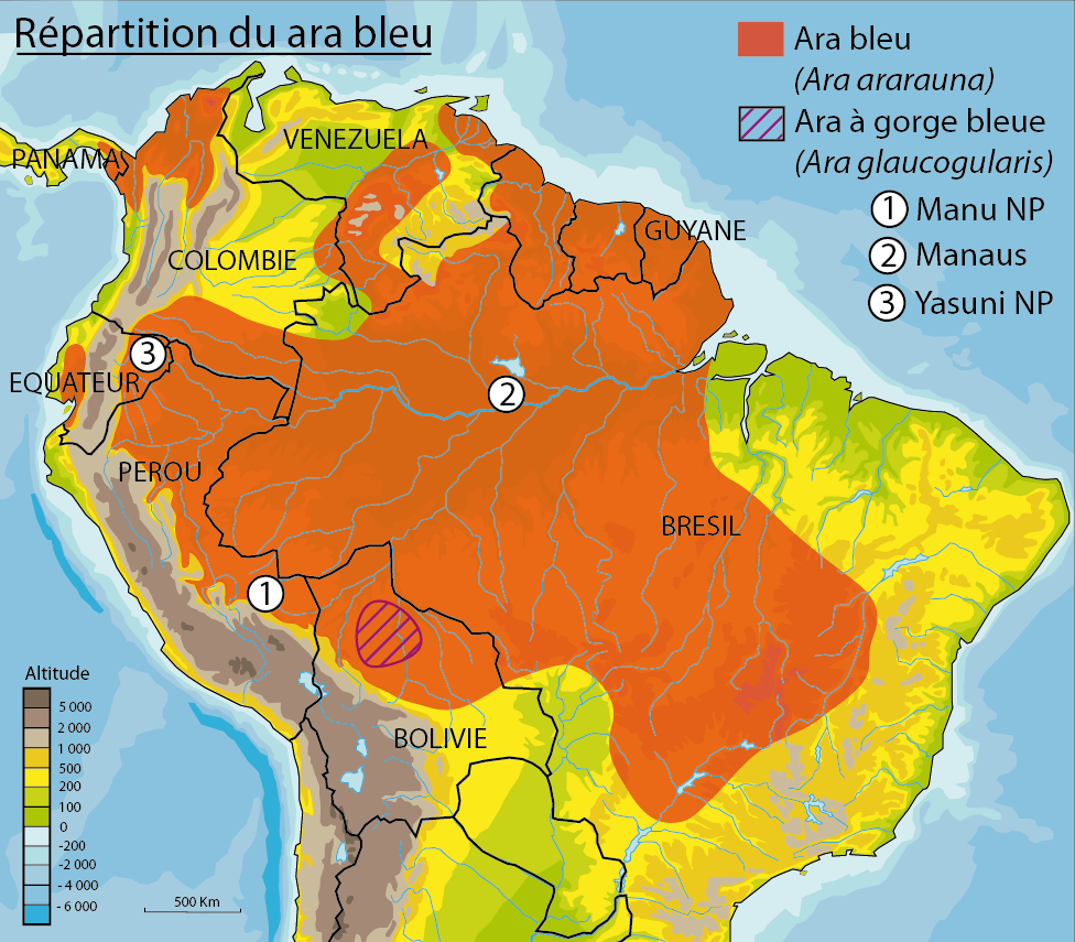 Le ara bleu peuple tout le bassin amazonien. Il déborde sur les pays voisins comme les Guyanes où les effectifs restent limités. Deux populations sont isolées à l’Ouest de la Cordillère des Andes :